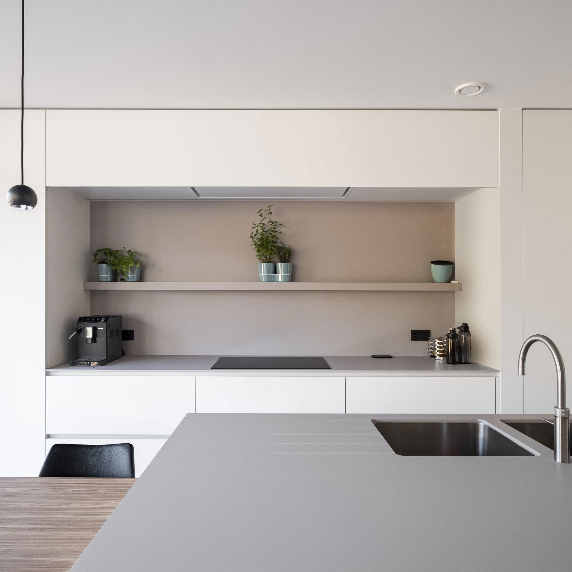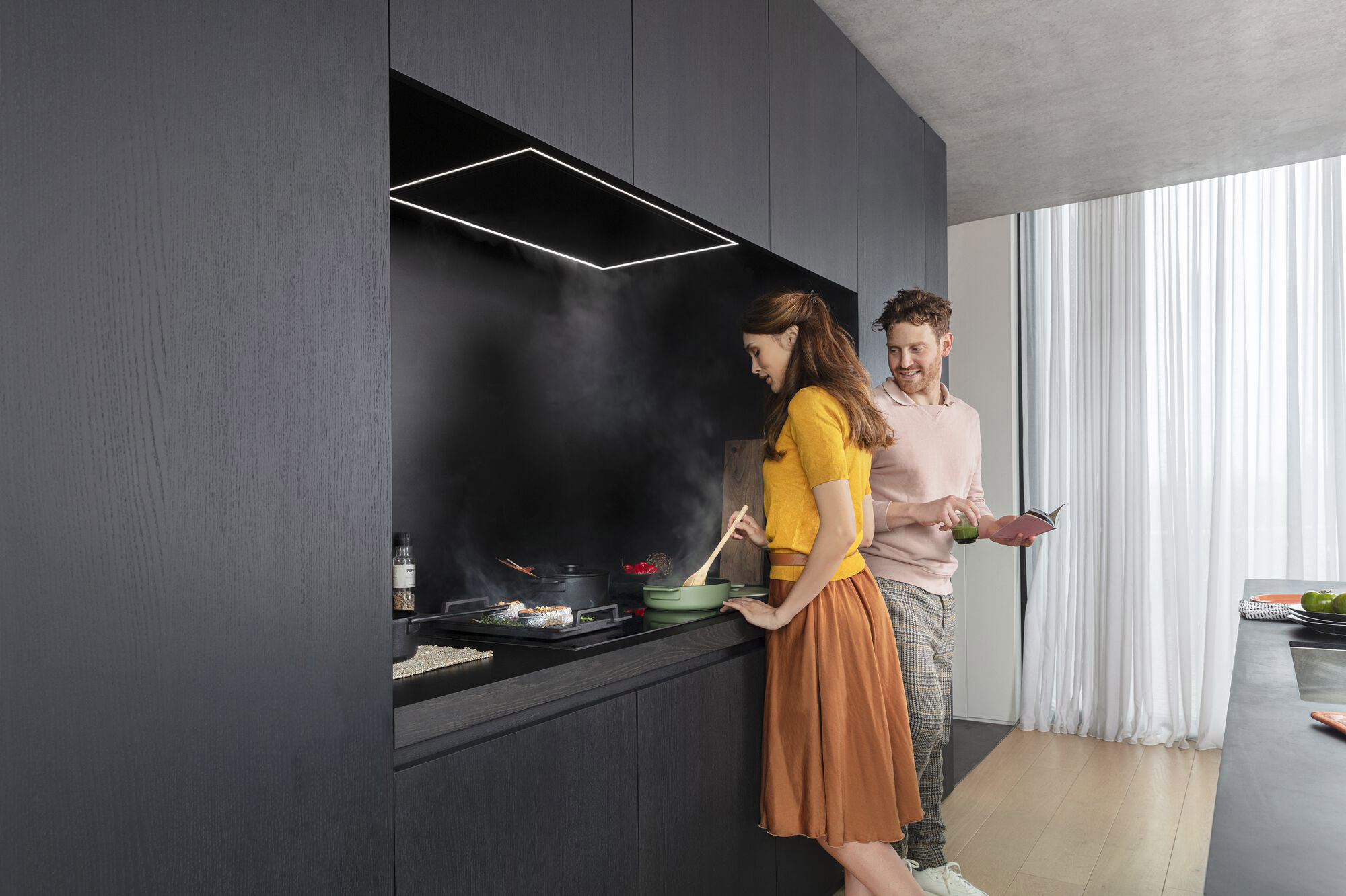 To maintain visual tranquillity, opt for a ceiling extractor hood from the Pureline range. These ceiling extractor hoods are, amongst other colours available in white. As a result, they perfectly match the light tones and soft colours and materials of the interior.
